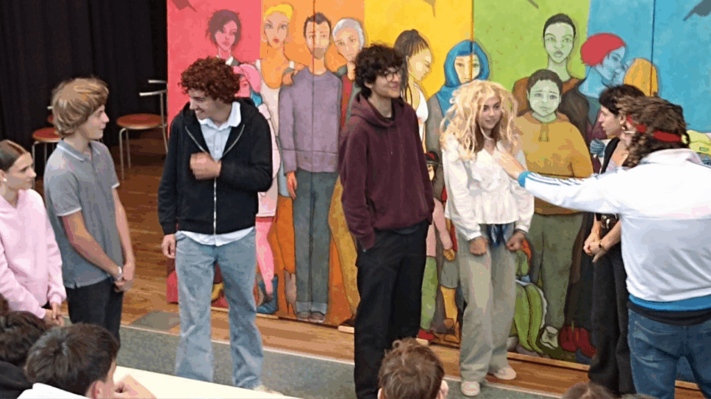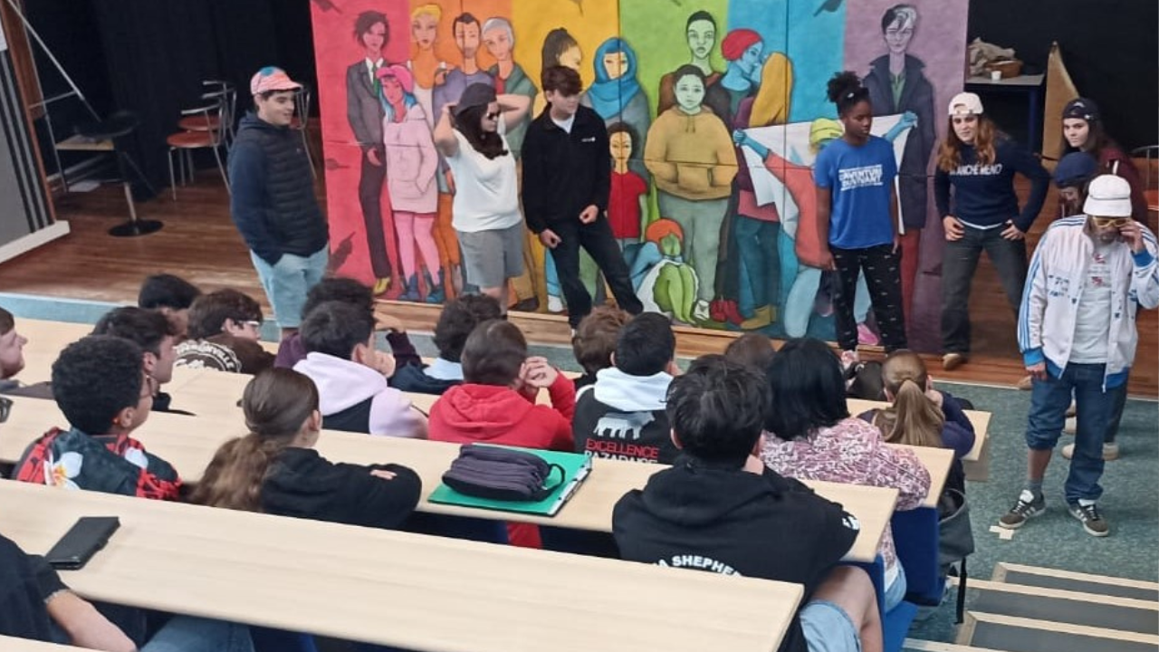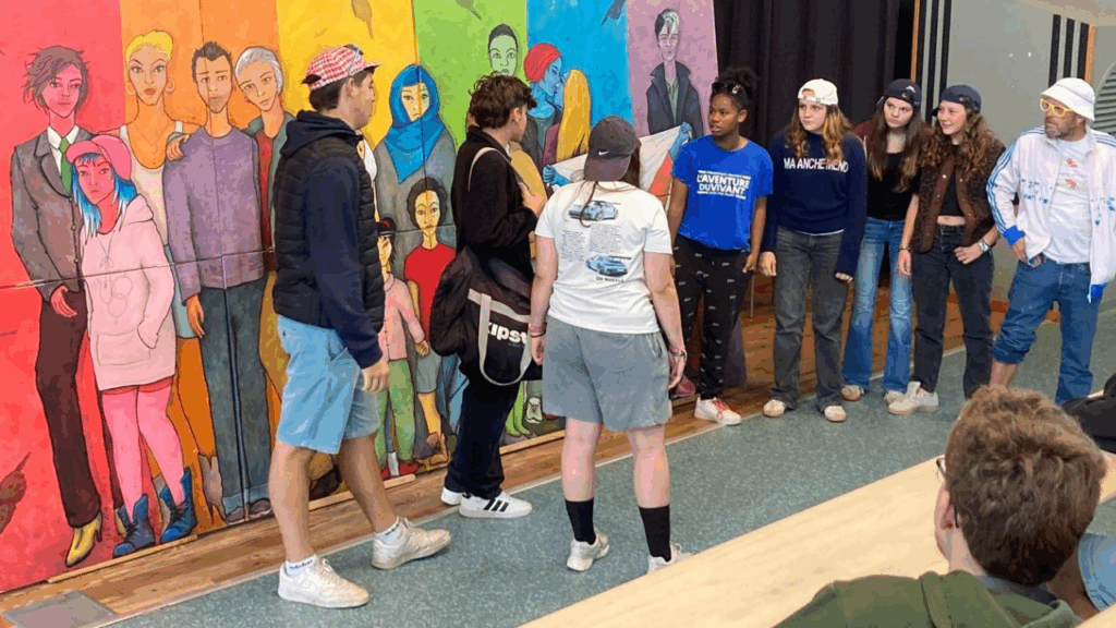 Les comédien.ne.s Flore, Anouk, christophe et Clément ont accompagné ce groupe bien énergique et plein d’humour durant les saynètes.