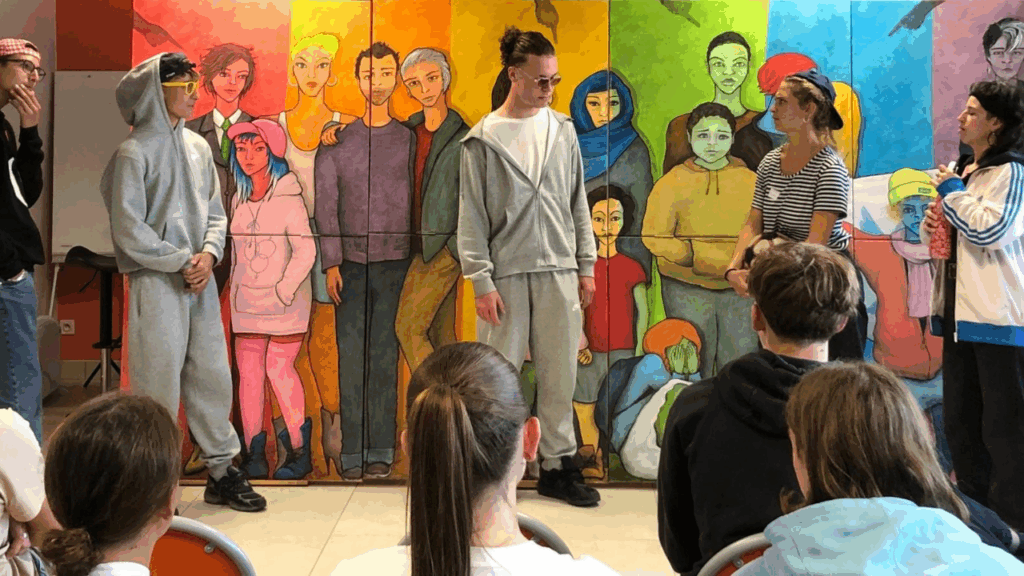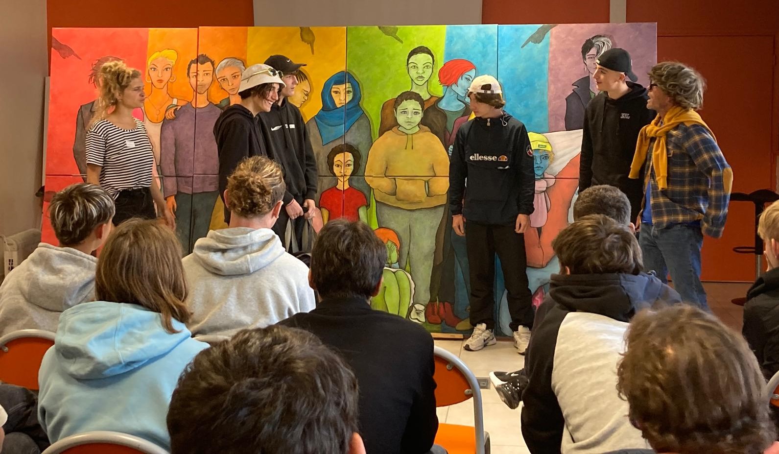 Le groupe de jeunes composé de jeunes hommes à une exception près (bravo à elle !), a montré un talent inné pour les prestations scéniques, accompagnés par nos comédiens Anouk, Yoann, Anita et Christophe.
