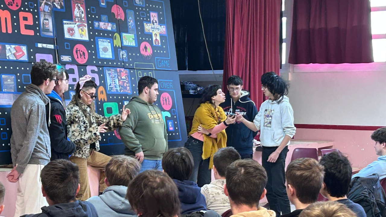 Le groupe de garçons (et une fille) nous a apporté un vent de fraîcheur en se prenant au jeu des saynètes et en pratiquant sur scène un humour décalé, encadré par Flore, Anouk et Clément du Trimaran.
