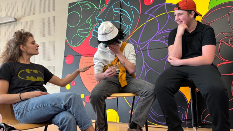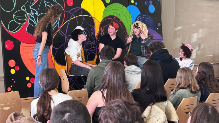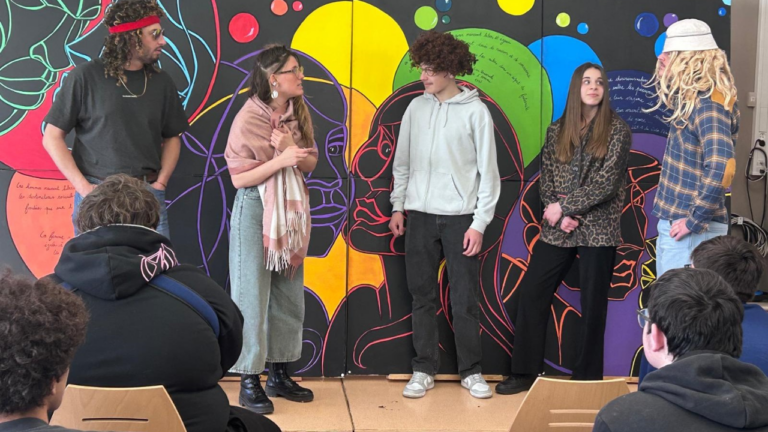Flore, Anita et Clément, nos comédiens, ont accompagné le groupe, qui s’est montré parfaitement à l’aise sur scène, interprétant les situations proposées dans les différentes saynètes avec conviction et naturel.