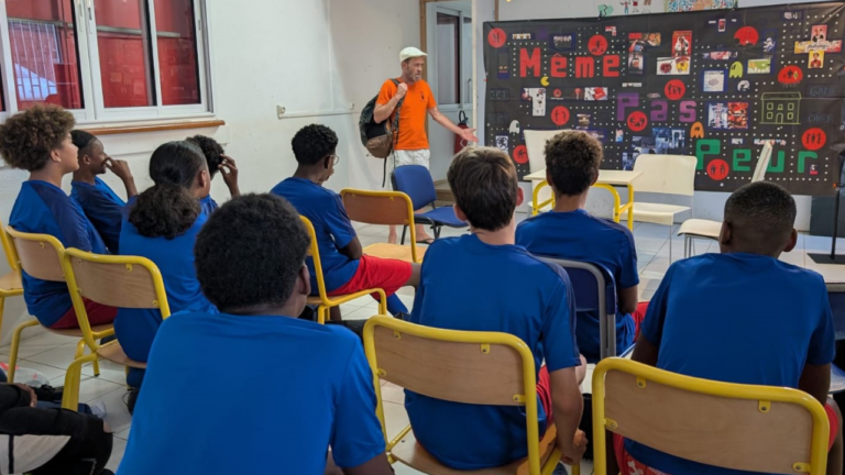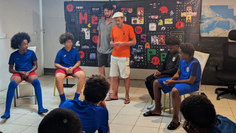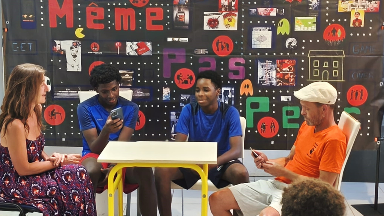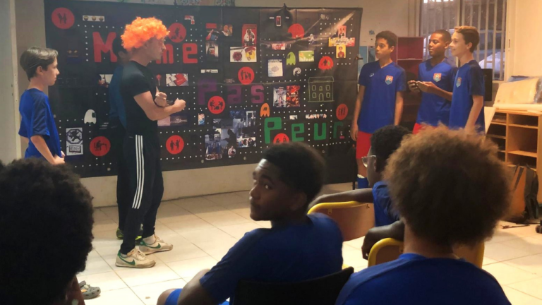 Les jeunes footballeurs du Club Solidarité Scolaire à Baie-Mahault ont vu et joué le spectacle « Même Pas Peur 2.0 ! » sur le harcèlement et le cyberharcèlement.